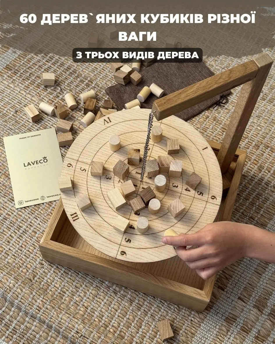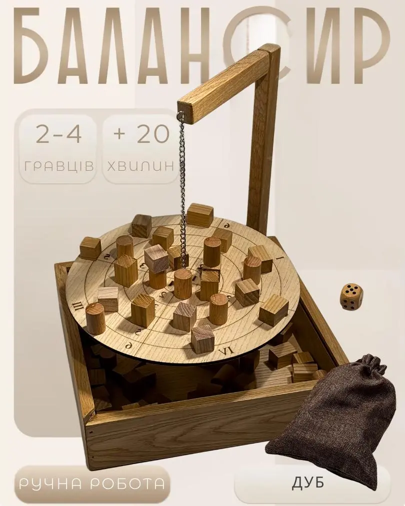 “Балансир” – це настільна гра, де потрібно по черзі ставити дерев’яні бруски на хитку платформу, утримуючи баланс конструкції.